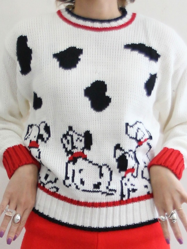 101匹ワンちゃんをモチーフにしたセーター 前後にワンちゃんのデザインがある愛らしい一枚です 状態:目立った傷汚れはございません。 ニットの網目がところどころ粗いです。写真にてご覧ください。(写真7-10枚) 片側の袖先に小さなほつれが見受けられます。(写真最後) 素材:アクリル size L 肩幅50 袖丈53 身幅47 着丈57cm model 163cm --------- <ご購入前にご確認ください> 当店の商品は、アメリカにて1点ずつハンドピックで買い付けた古着です。 検品のうえ出品しておりますが、見落としがある場合もございます。 古着特有の使用感・ほつれ・汚れなどがあることをご了承ください。 店頭でも同時販売しているため、 タイミングによっては売り切れとなる場合がございます。 また、返品・交換は一切お受けできませんのでご了承ください。 ⚫︎発送について ・簡易包装での発送となります。 ・急ぎの発送は対応できない場合がございます。 ・実店舗の休業日は、発送もお休みです。 (営業日はInstagramにてご案内しております。)