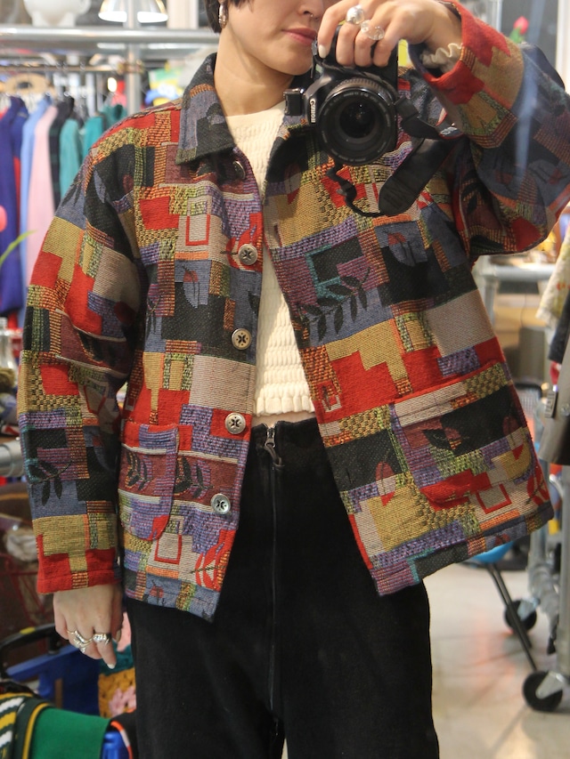 タペストリー柄、落ち着いたトーンのカラフルな色彩、遊び心のあるインド製のジャケット 袖丈の長さ腕周り、胴回り、ほどよく余白がありスタイリングしやすいサイズ感です フロントにはポケットが2つ付いております 少し硬めのしっかりとした生地感です 状態:気になるほどではないですがよーくみると、ゴブラン織特有の小さなほつれが見受けられる箇所が二つございます。(写真最後2枚) 素材:60%コットン 40%ポリエステル made in INDIA size XL 肩幅46 袖丈58 身幅60 着丈71cm model 163cm --------- <ご購入前にご確認ください> 当店の商品は、アメリカにて1点ずつハンドピックで買い付けた古着です。 検品のうえ出品しておりますが、見落としがある場合もございます。 古着特有の使用感・ほつれ・汚れなどがあることをご了承ください。 店頭でも同時販売しているため、 タイミングによっては売り切れとなる場合がございます。 また、返品・交換は一切お受けできませんのでご了承ください。 ⚫︎発送について ・簡易包装での発送となります。 ・急ぎの発送は対応できない場合がございます。 ・実店舗の休業日は、発送もお休みです。 (営業日はInstagramにてご案内しております。)