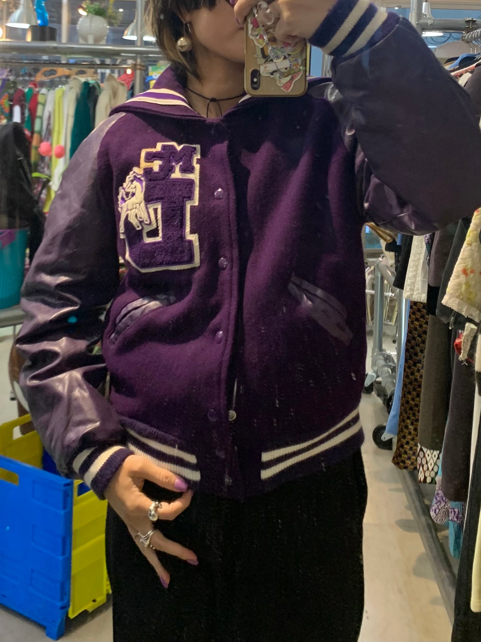 パープルカラーが際立つ1枚、中綿入りなので防寒性もございます。