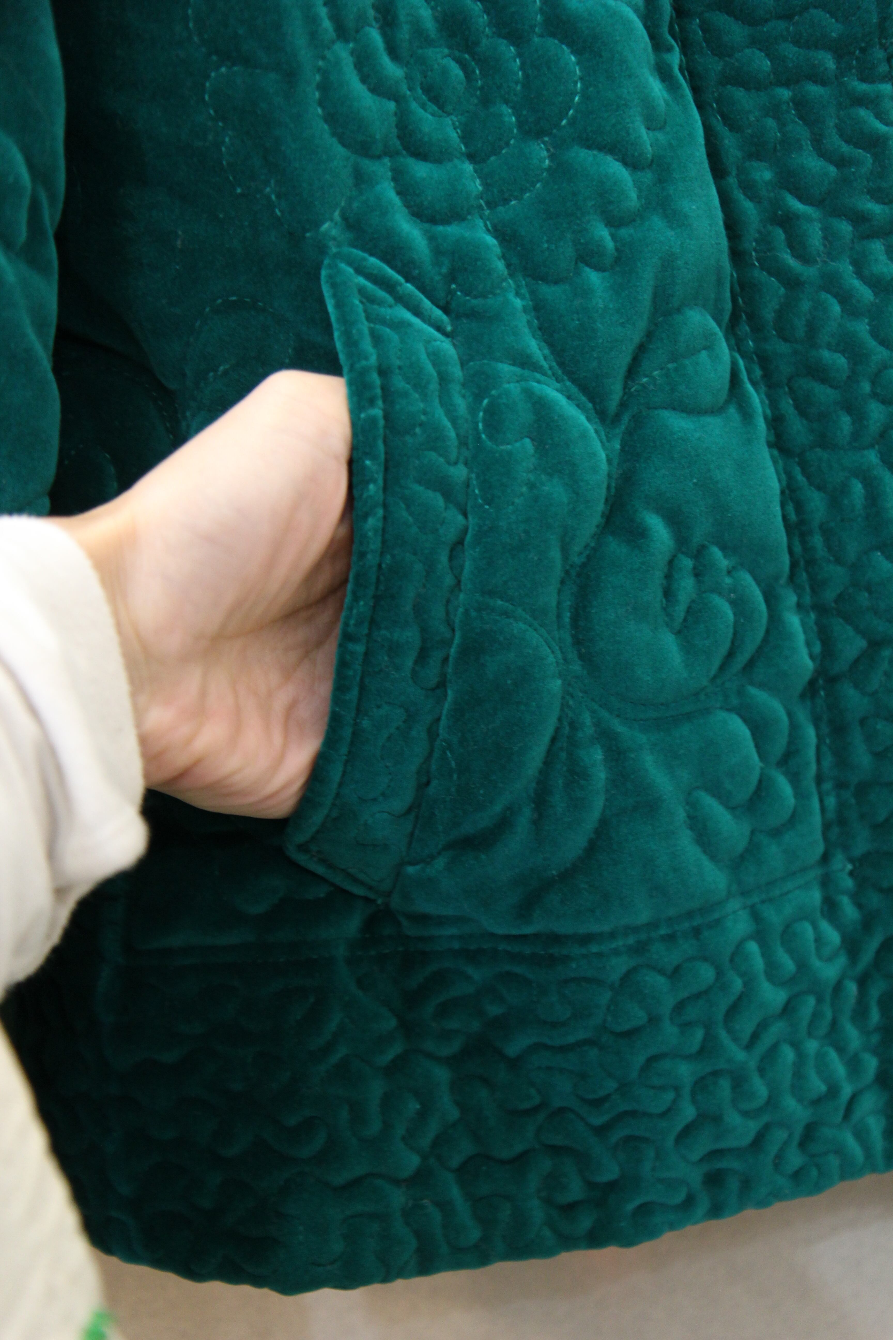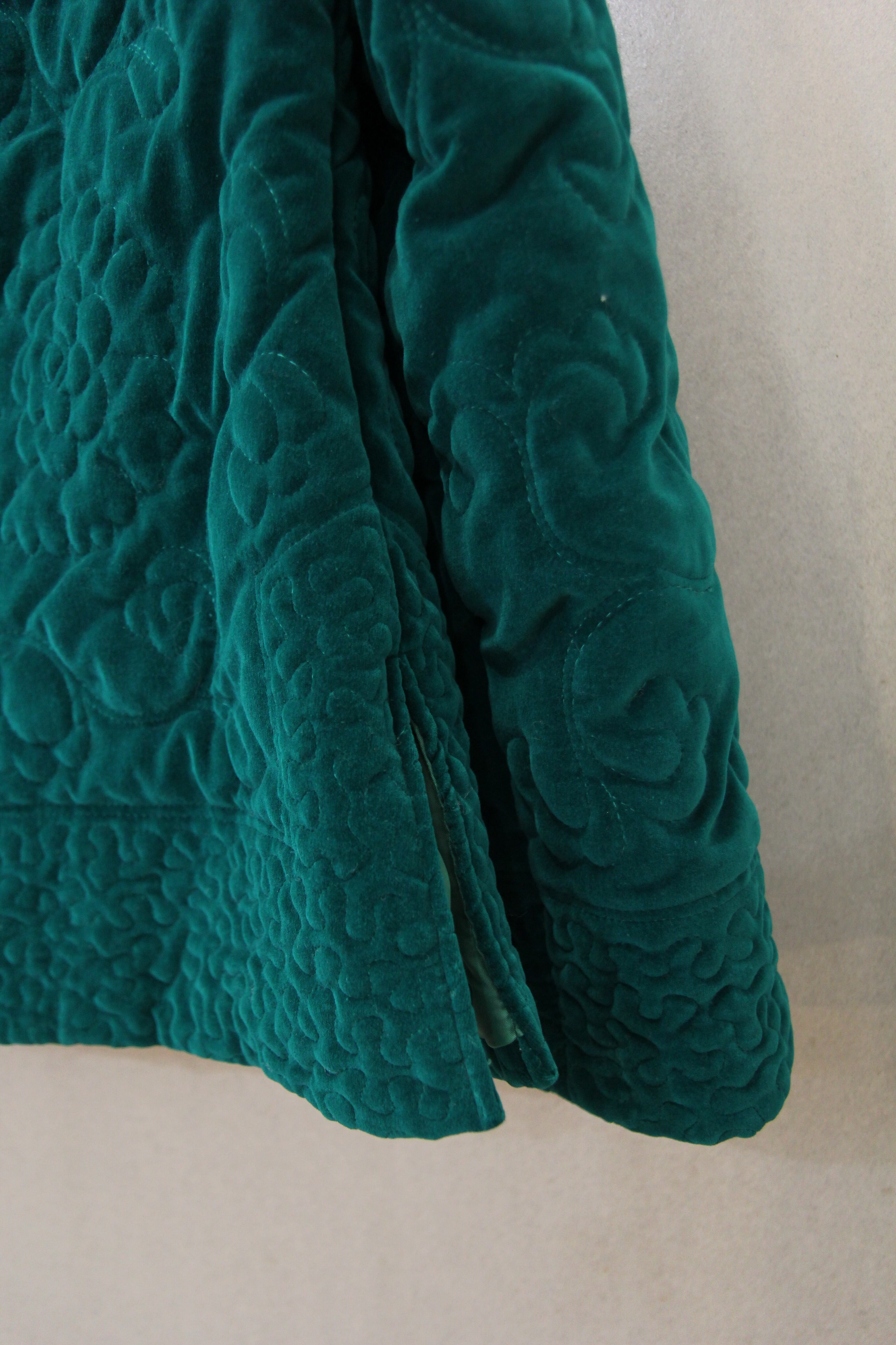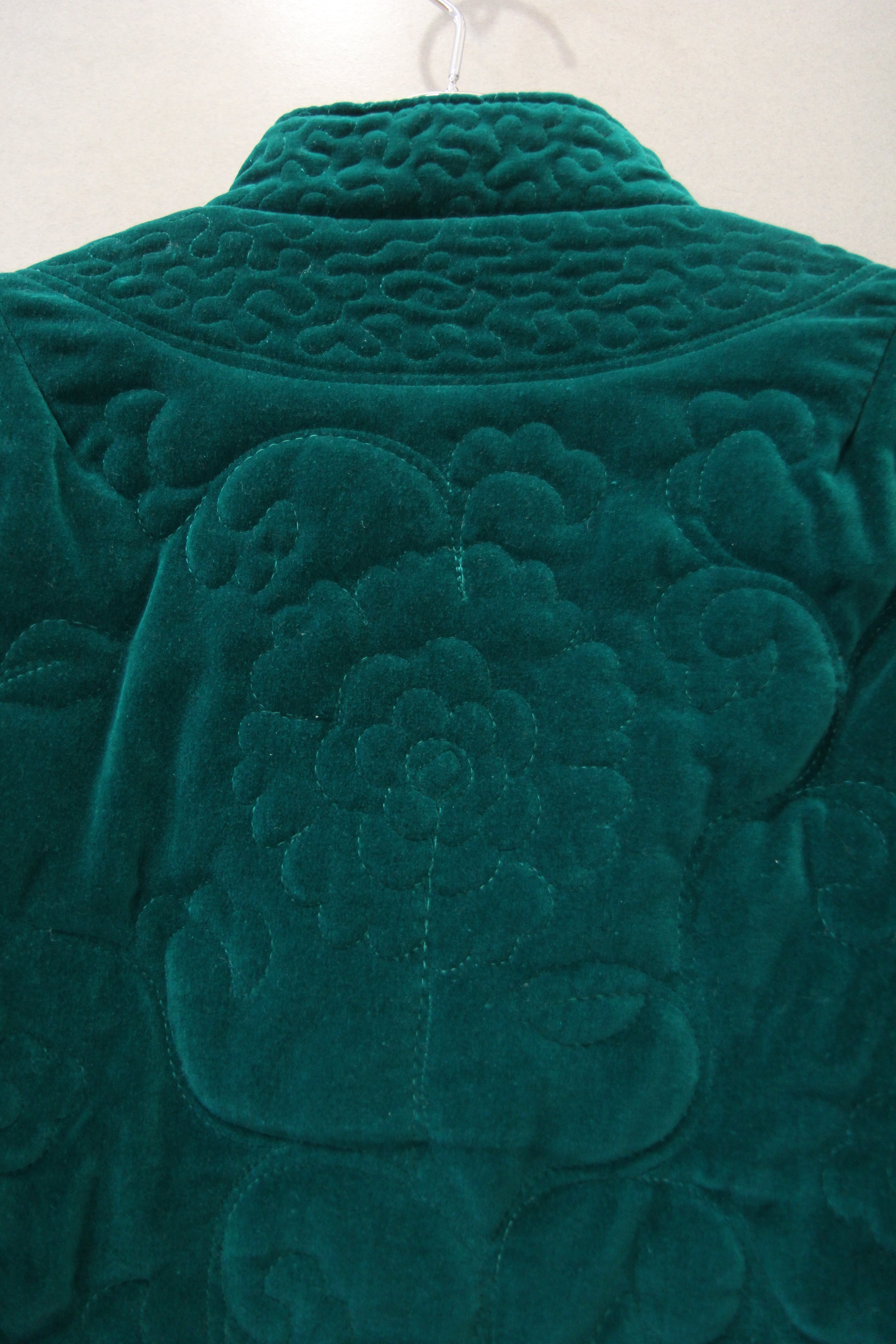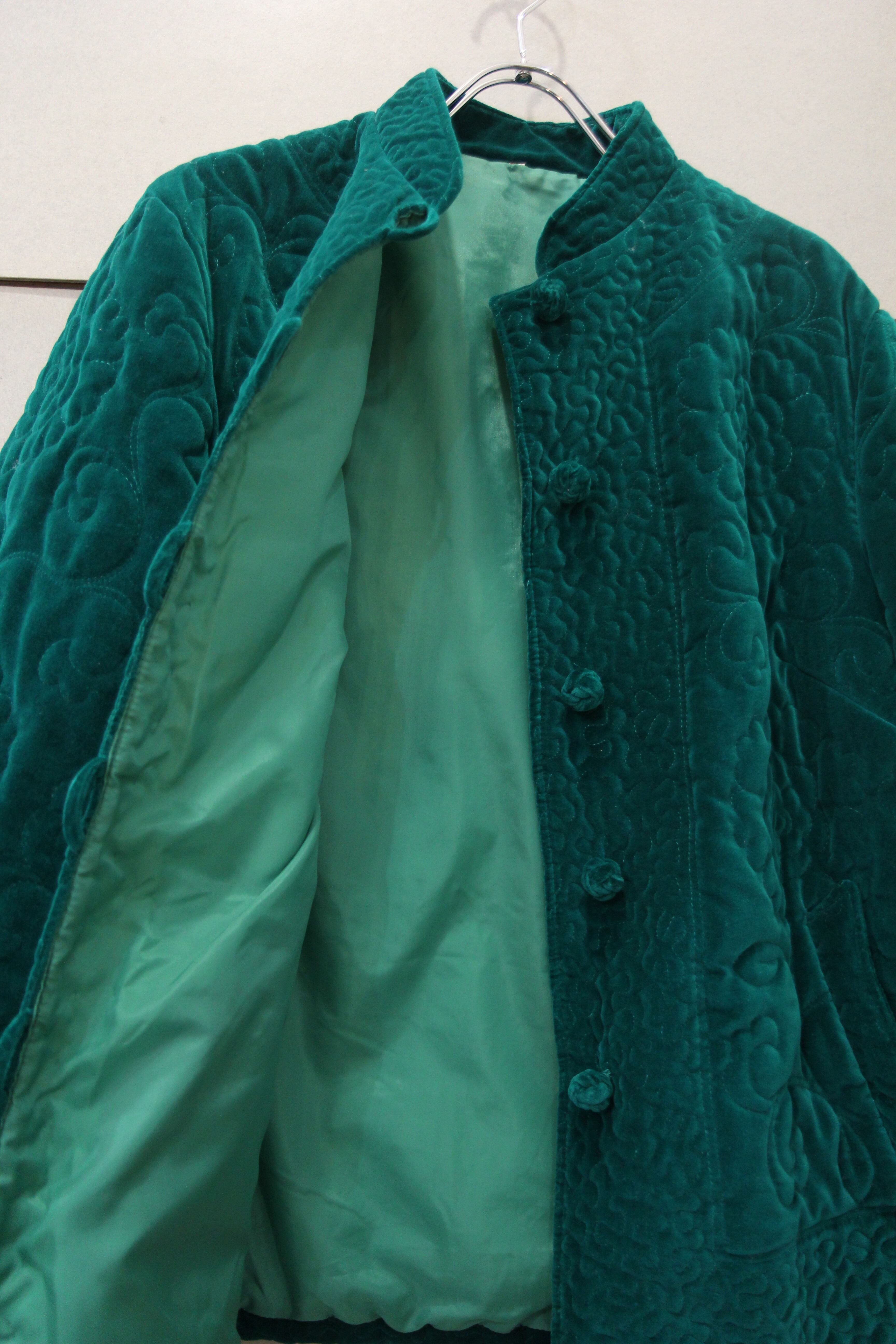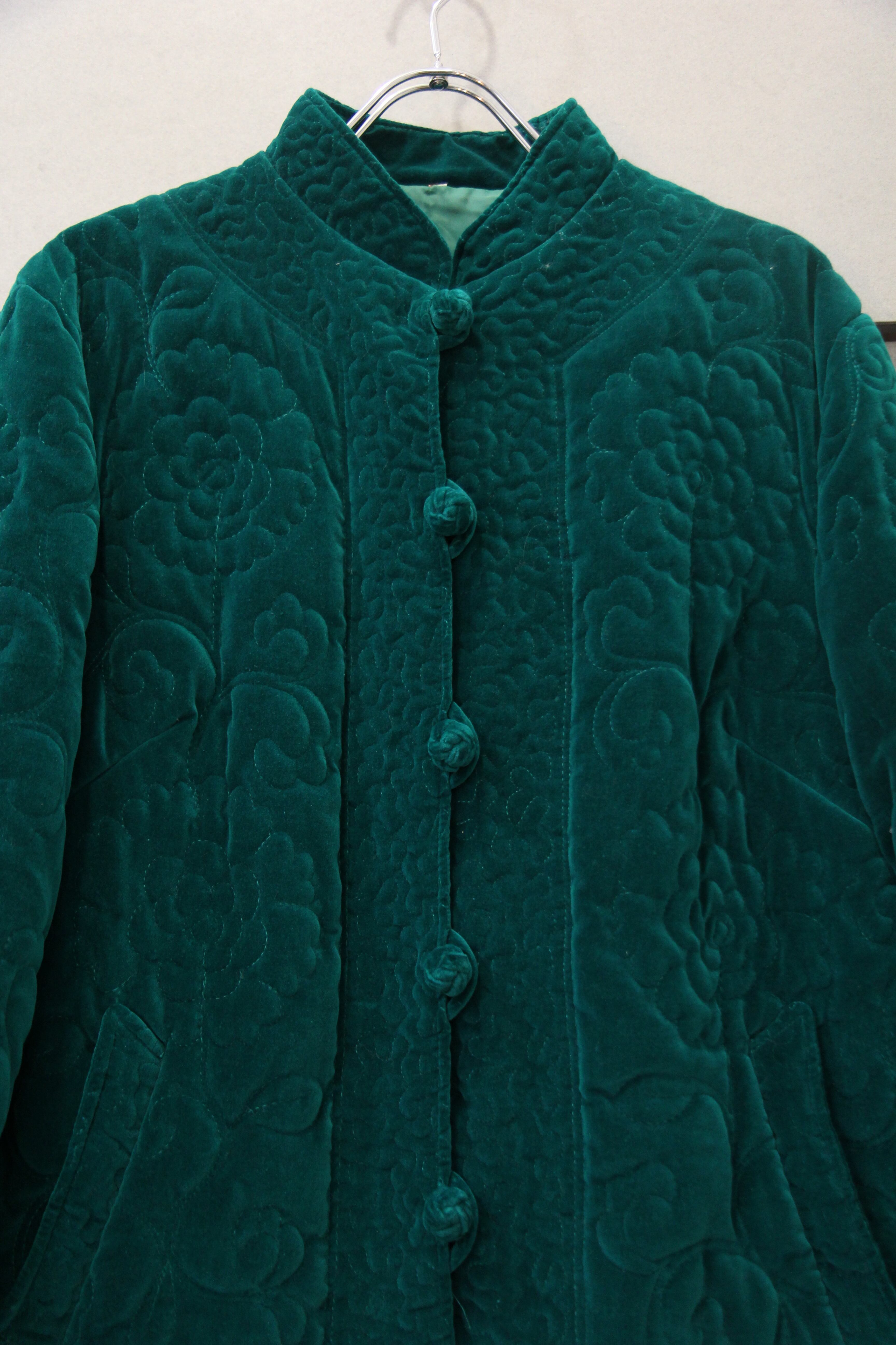 大きく丸みのあるチャイナボタンの留め具、全体にほどこされた刺繍、品のあるグリーンの色味も相まって、特別なデザイン、特別な1枚です