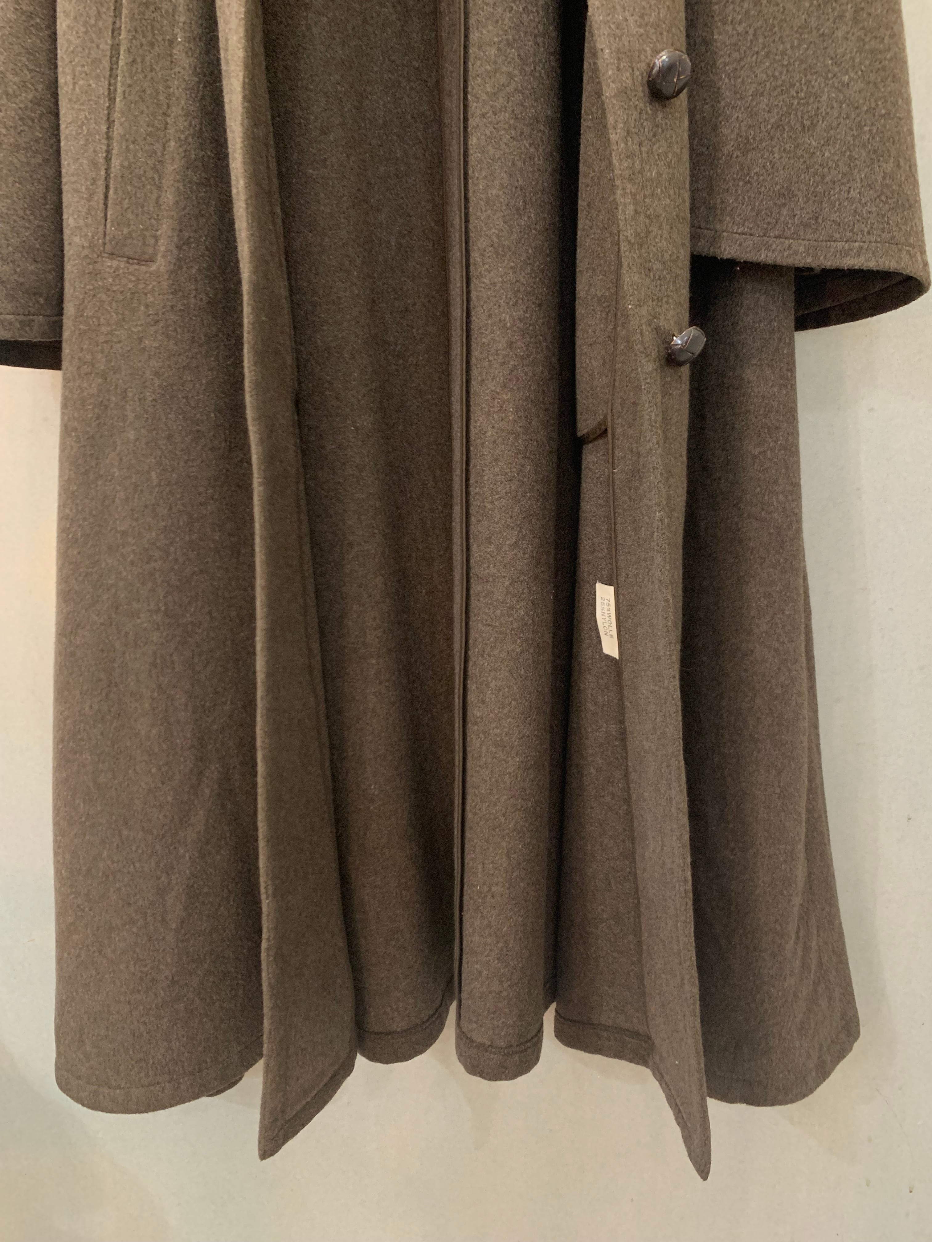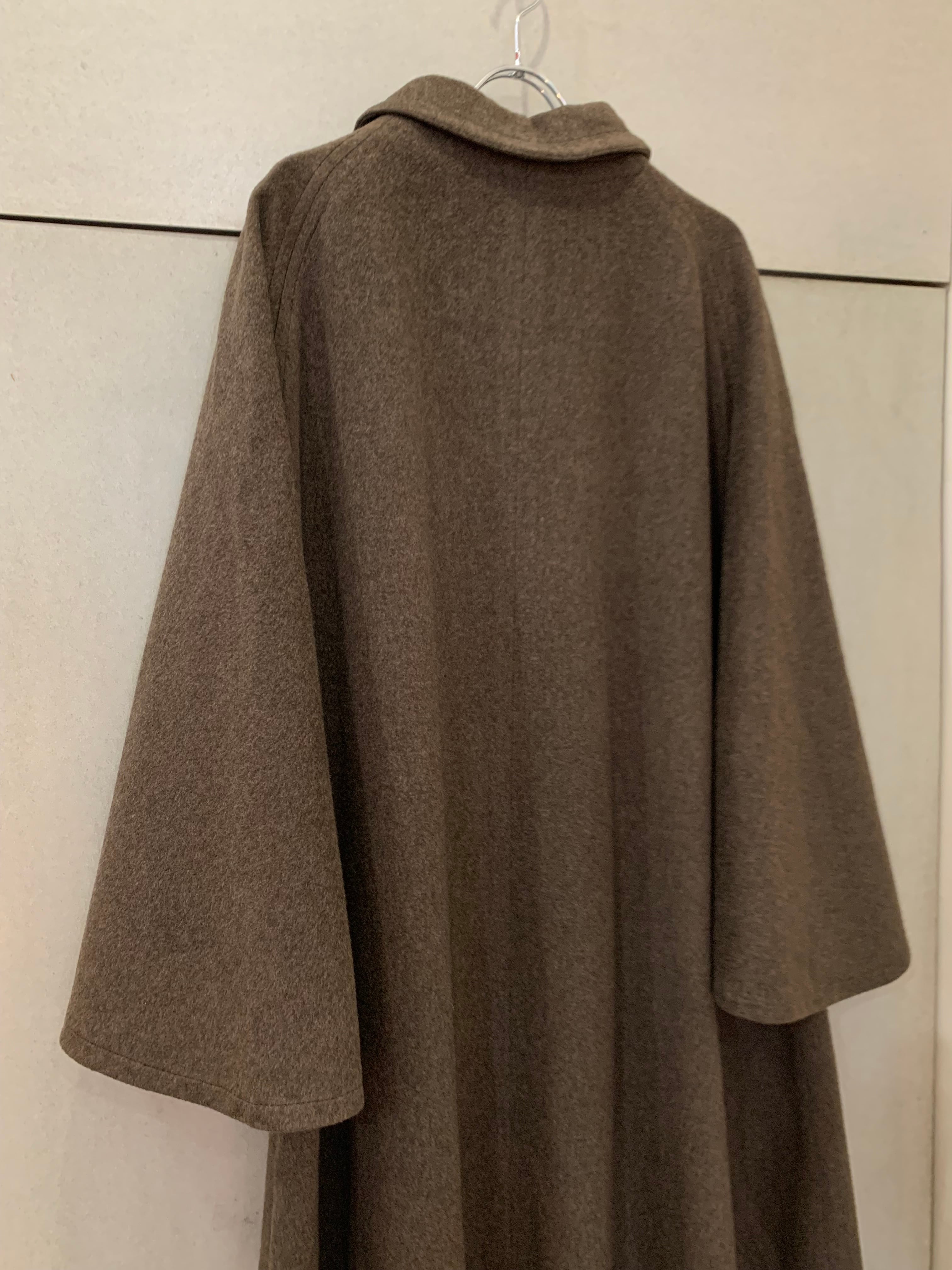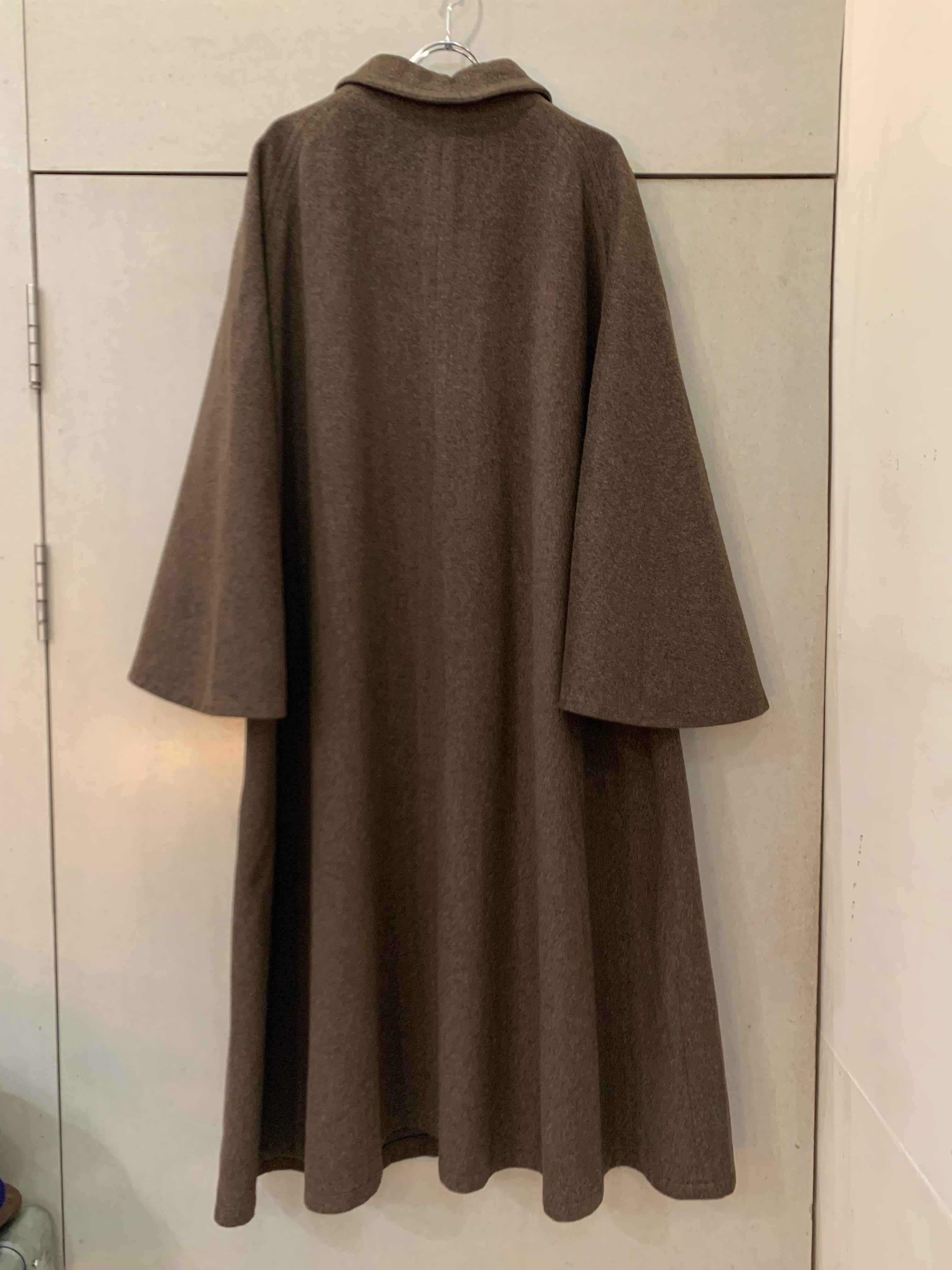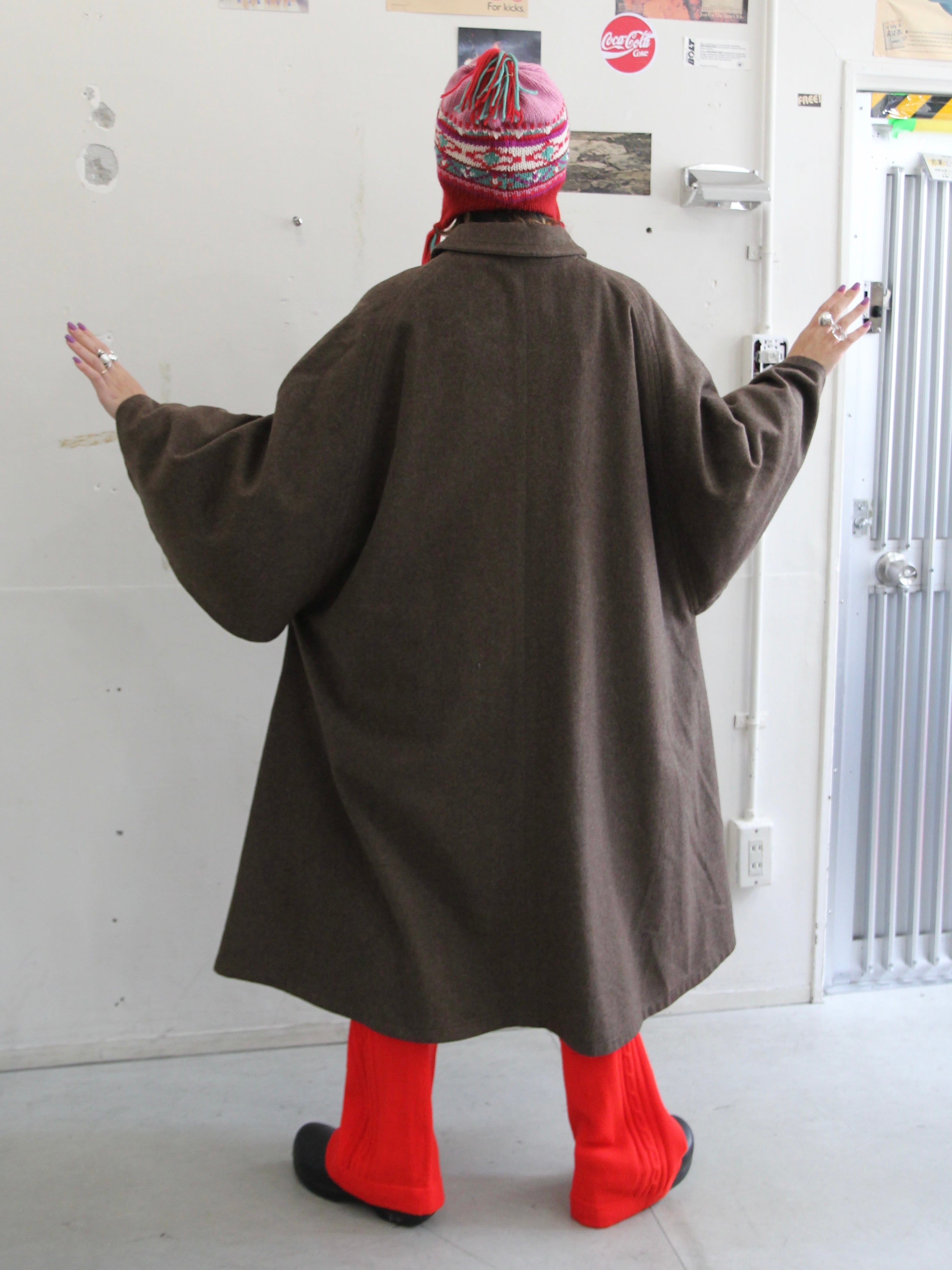 ポンチョやケープのような袖デザイン、ぷっくりとした胡桃ボタン、コーディネートしやすいブラウンカラー。