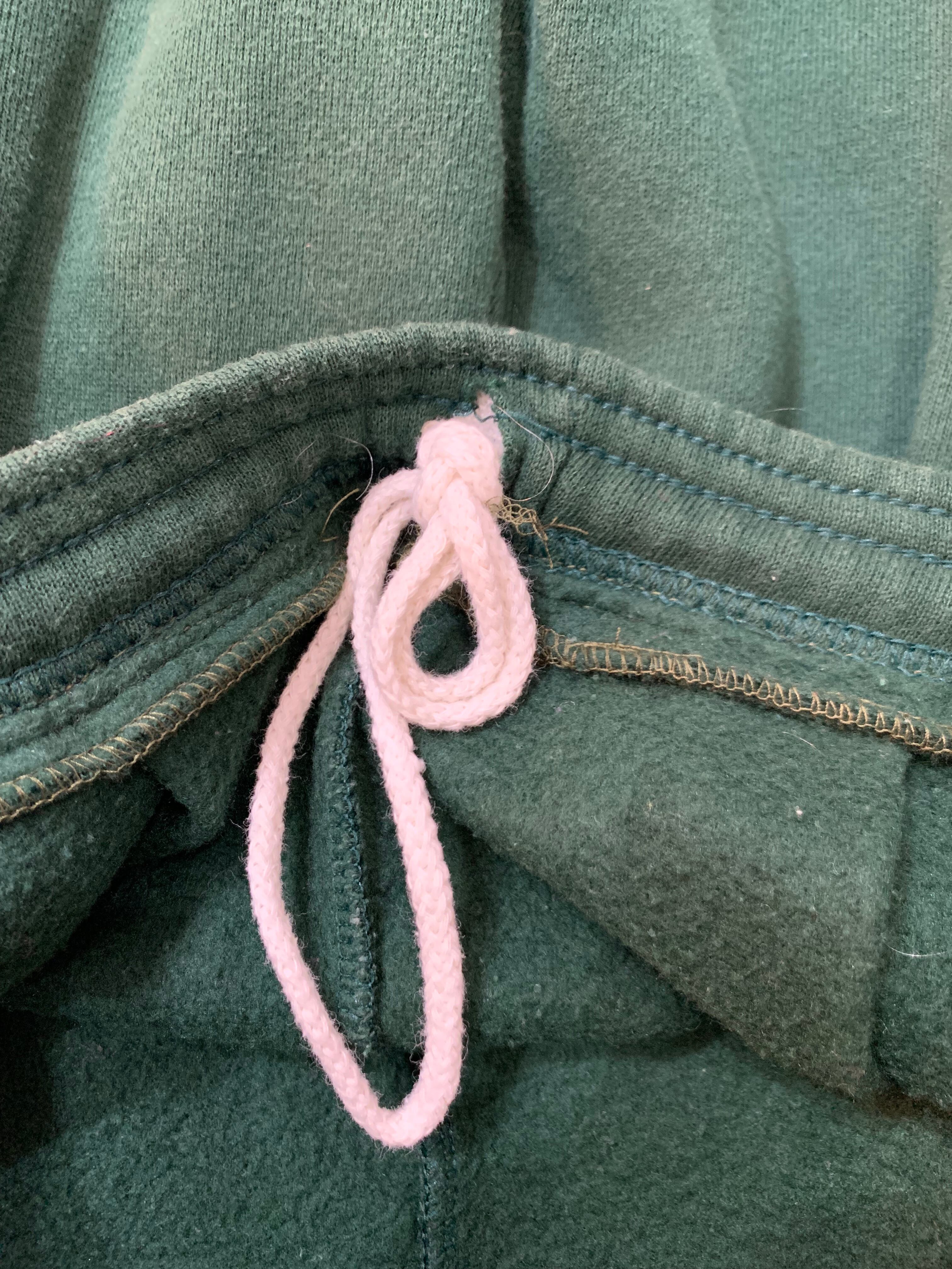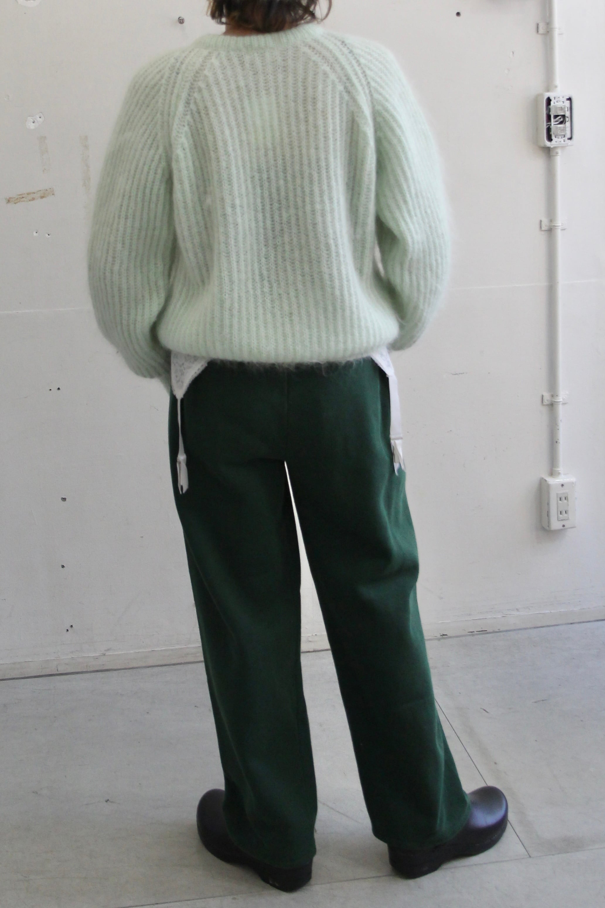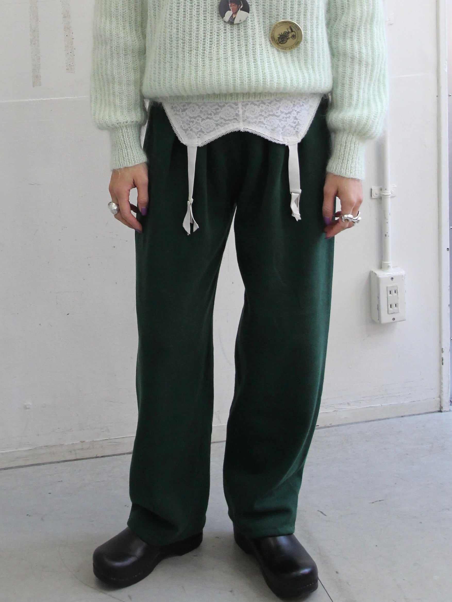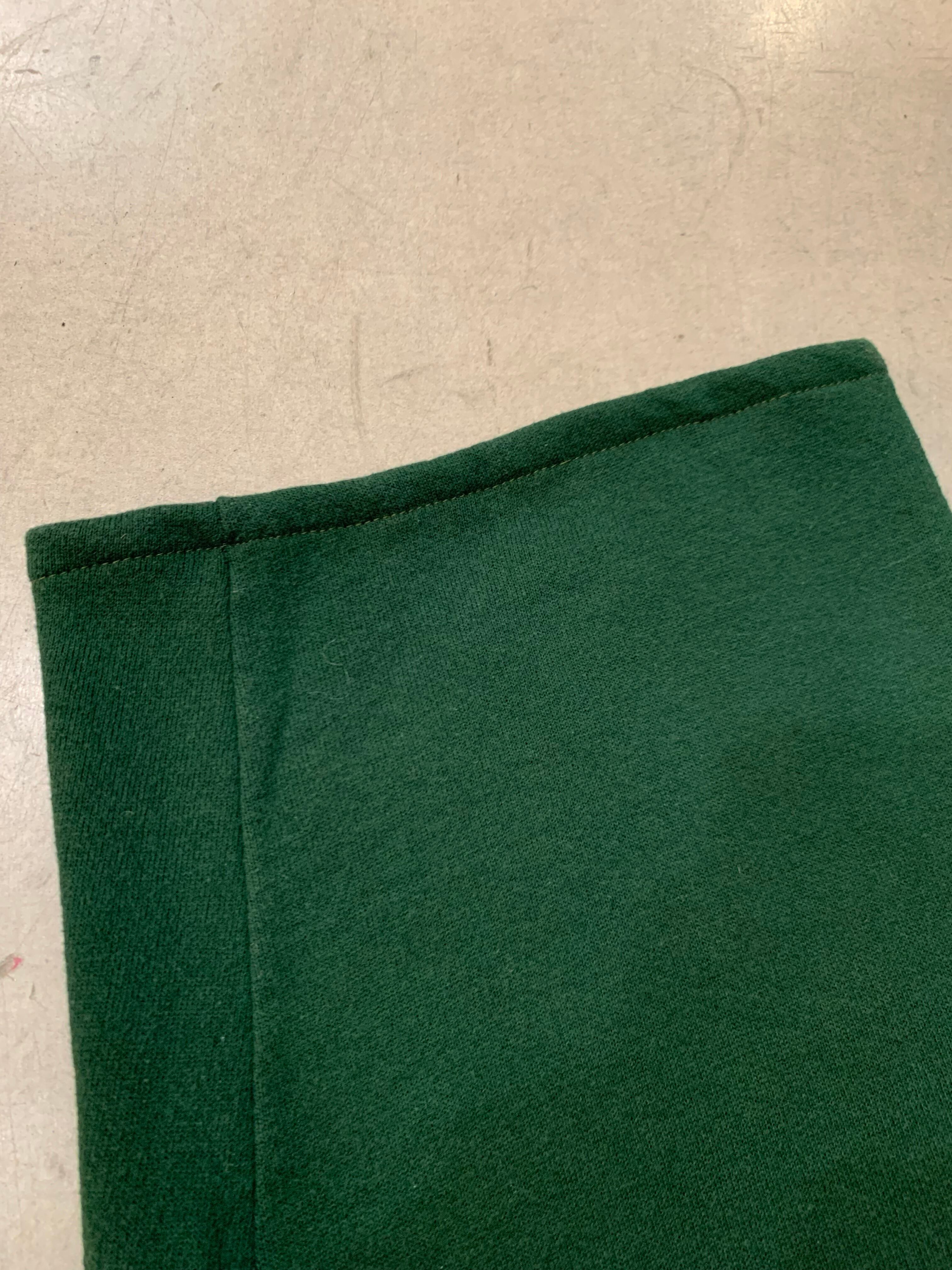 シルエットがきれいなダークグリーンのスウェットボトム