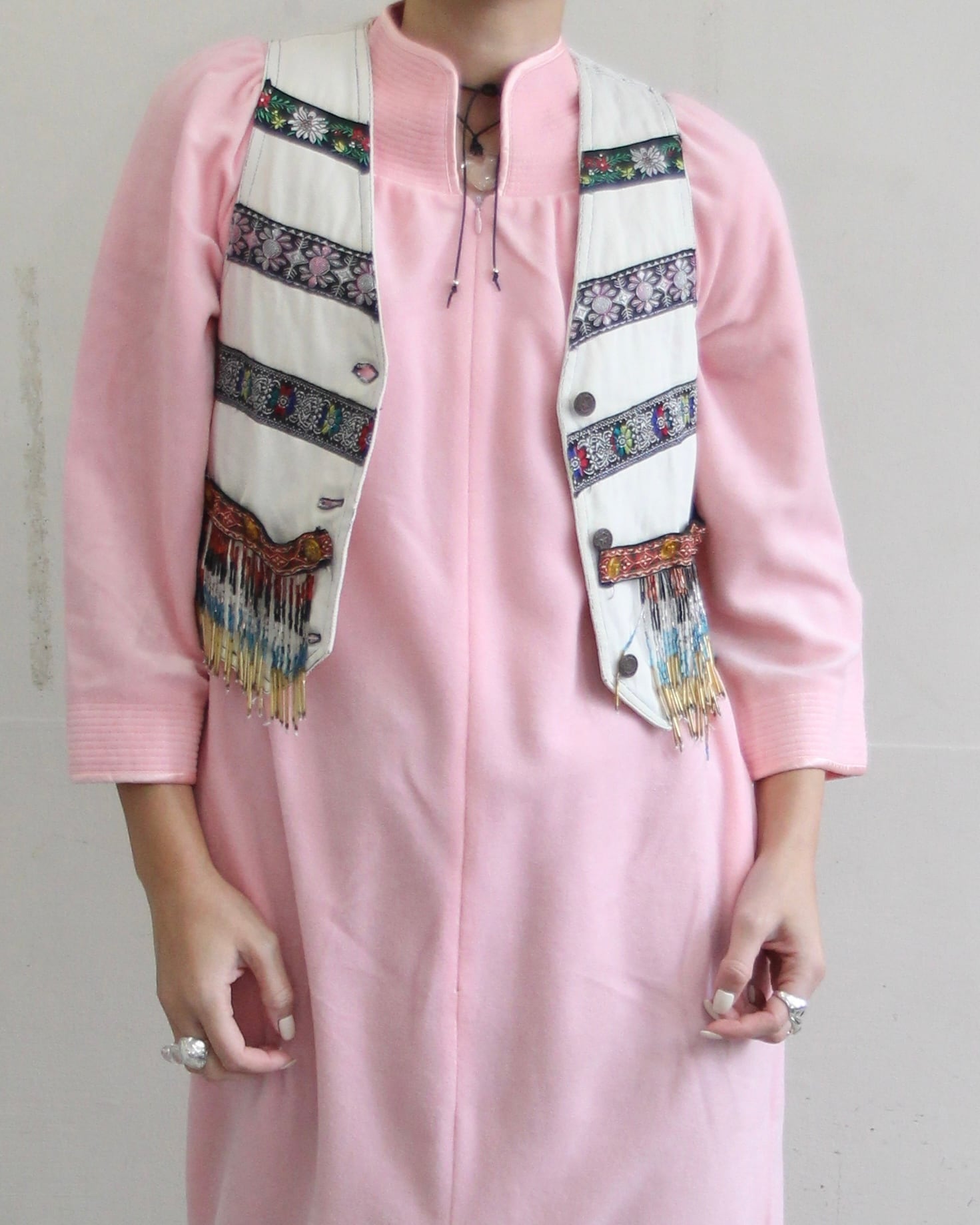 ビーズのフリンジ装飾が動くたびに揺れるベスト
