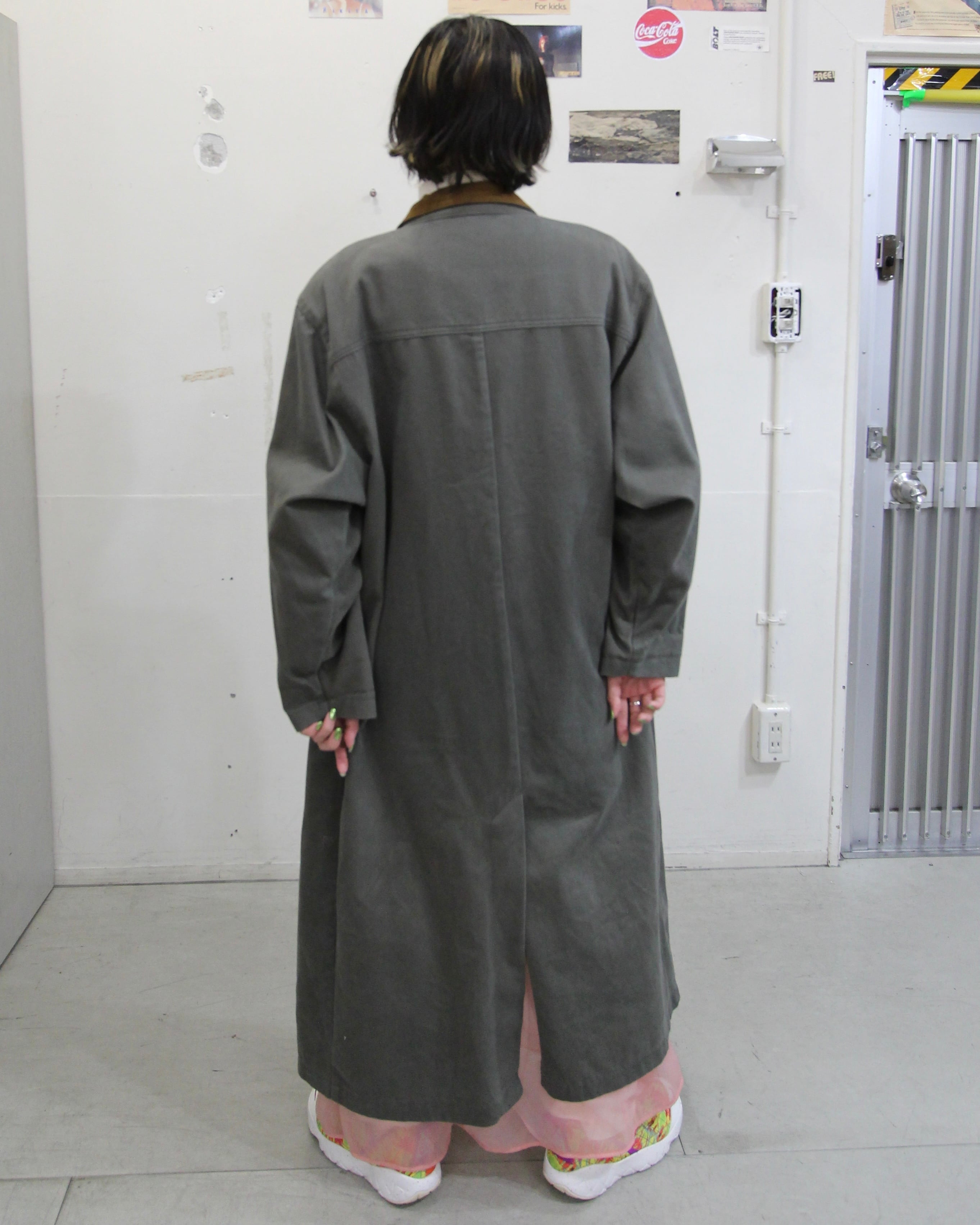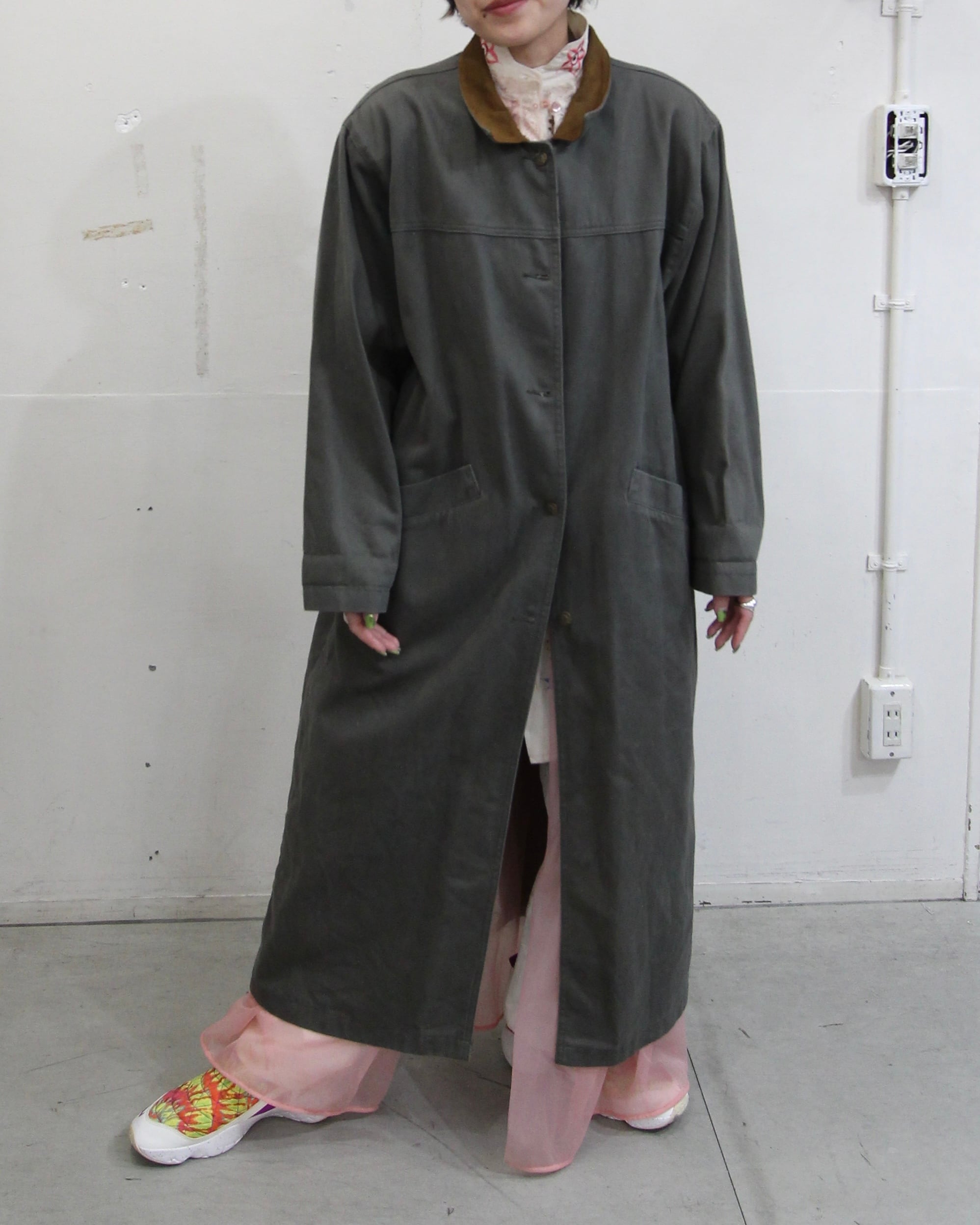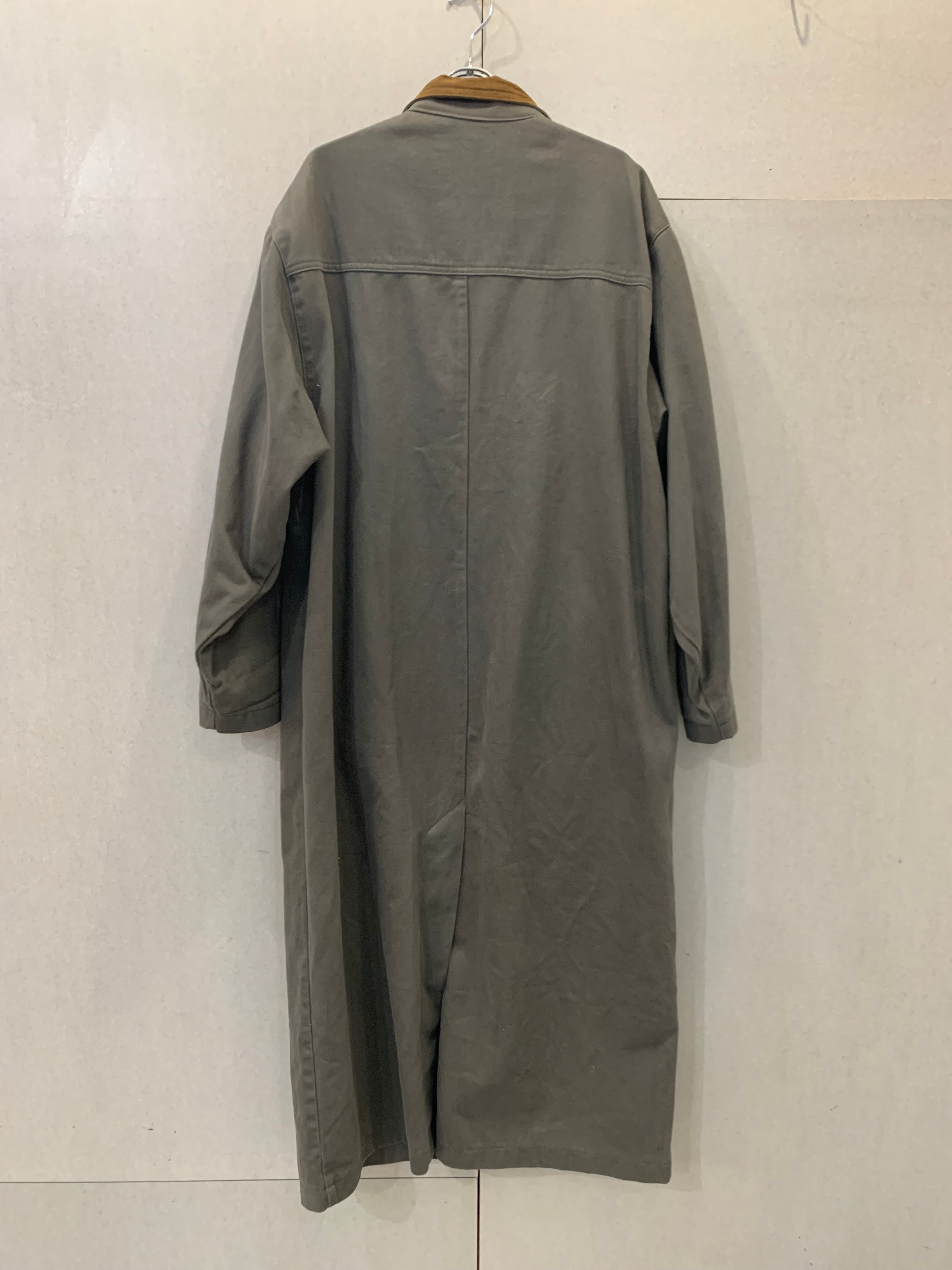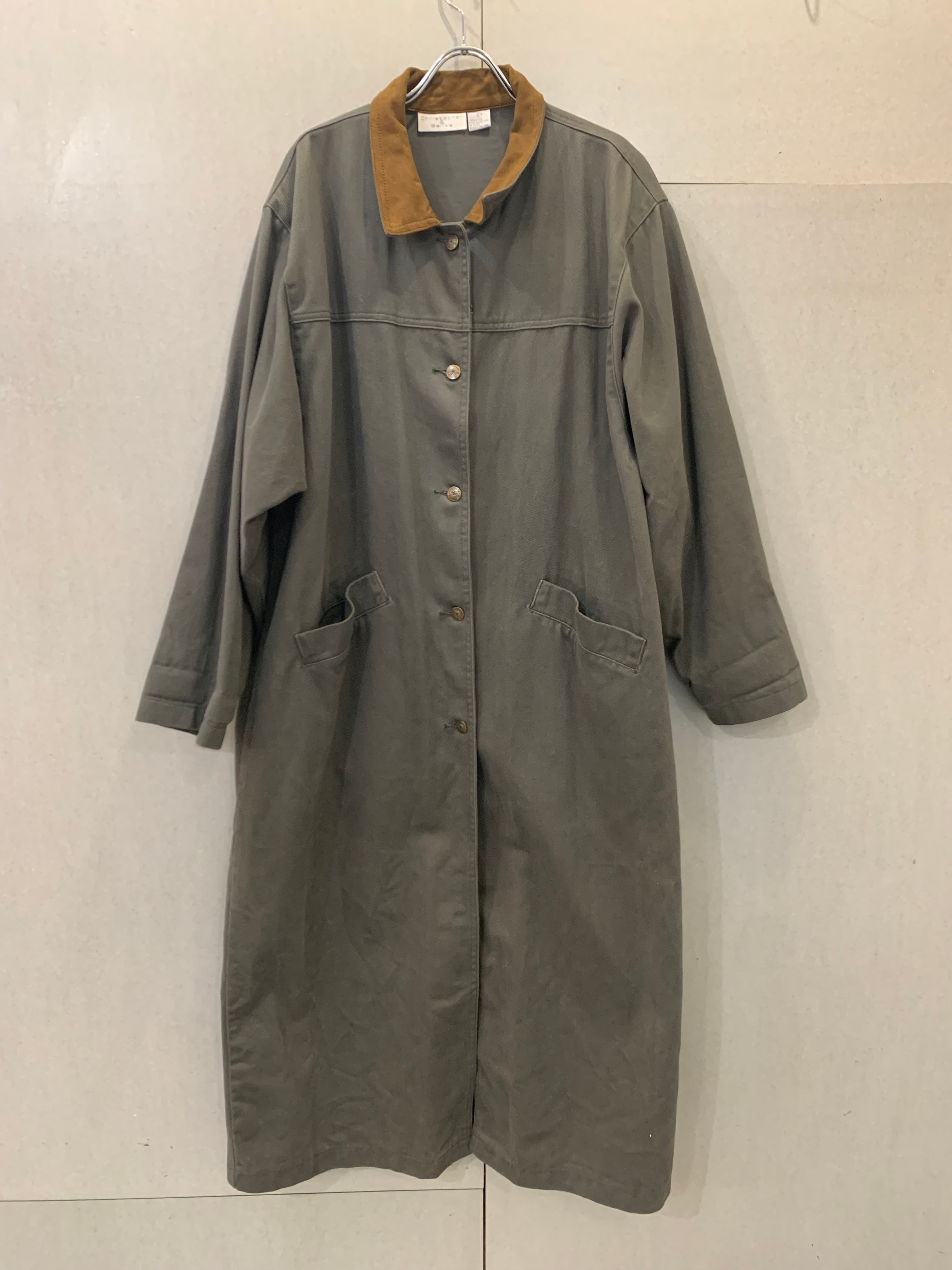 カーキのデニムコート、しかも足首まであるフルレングス