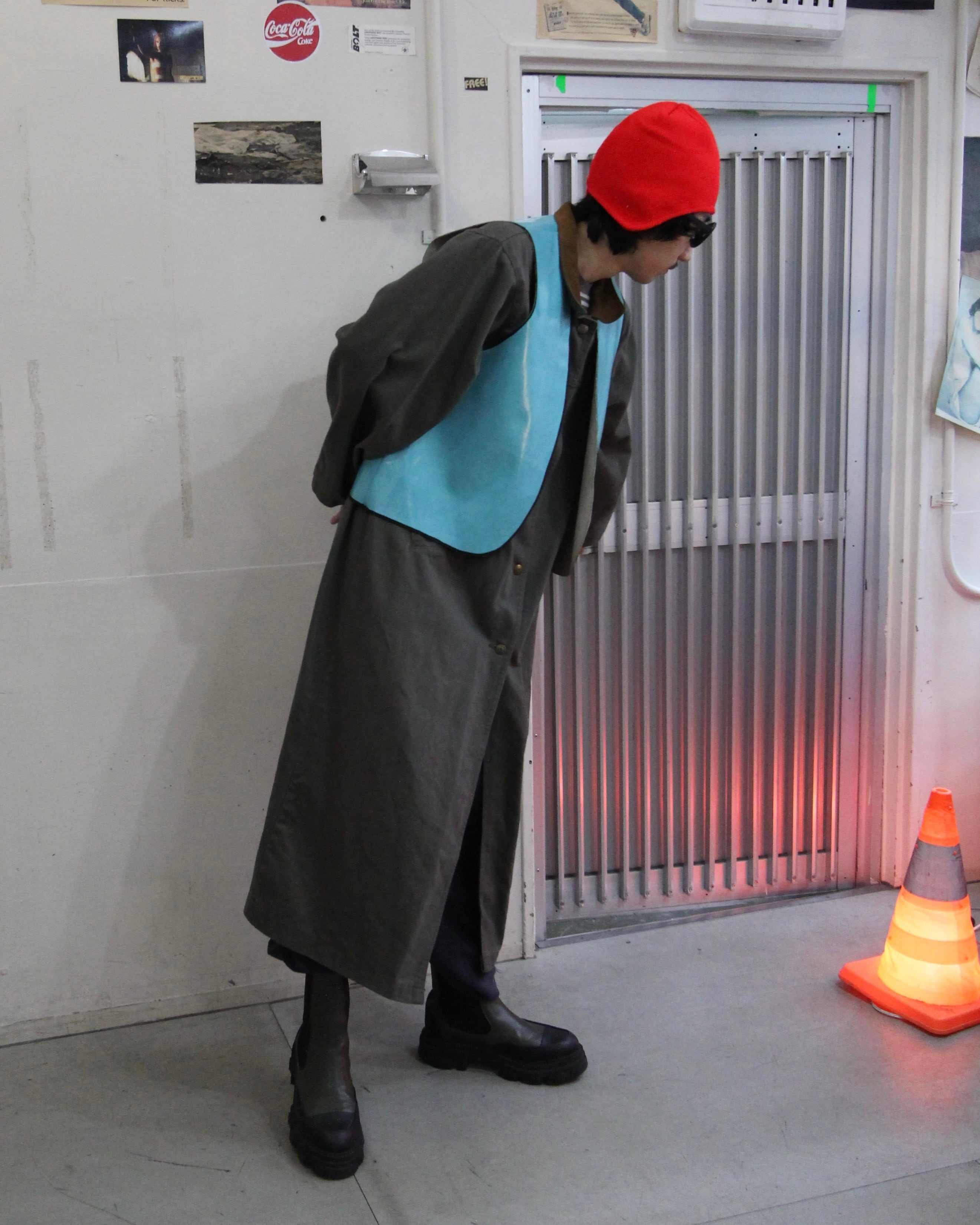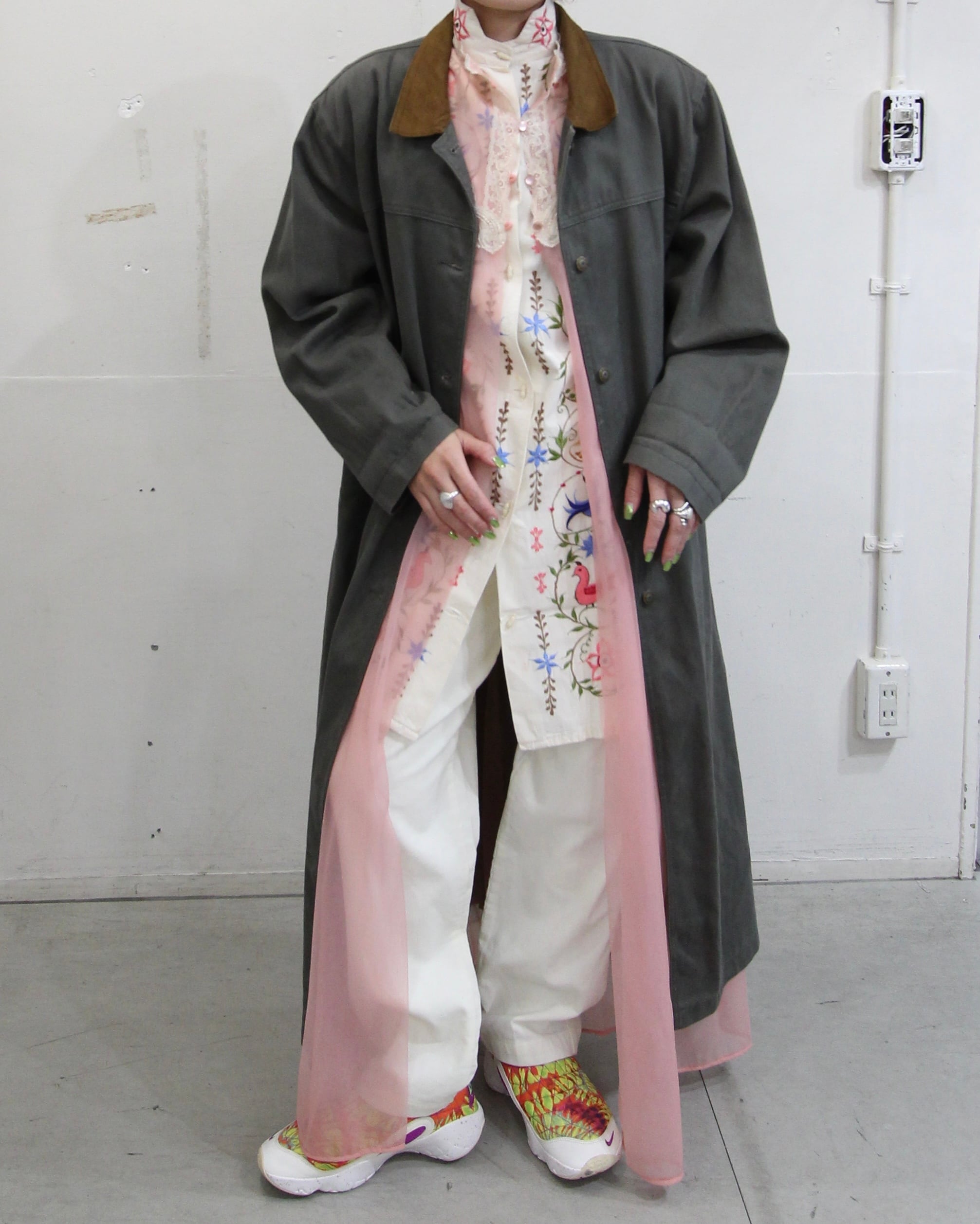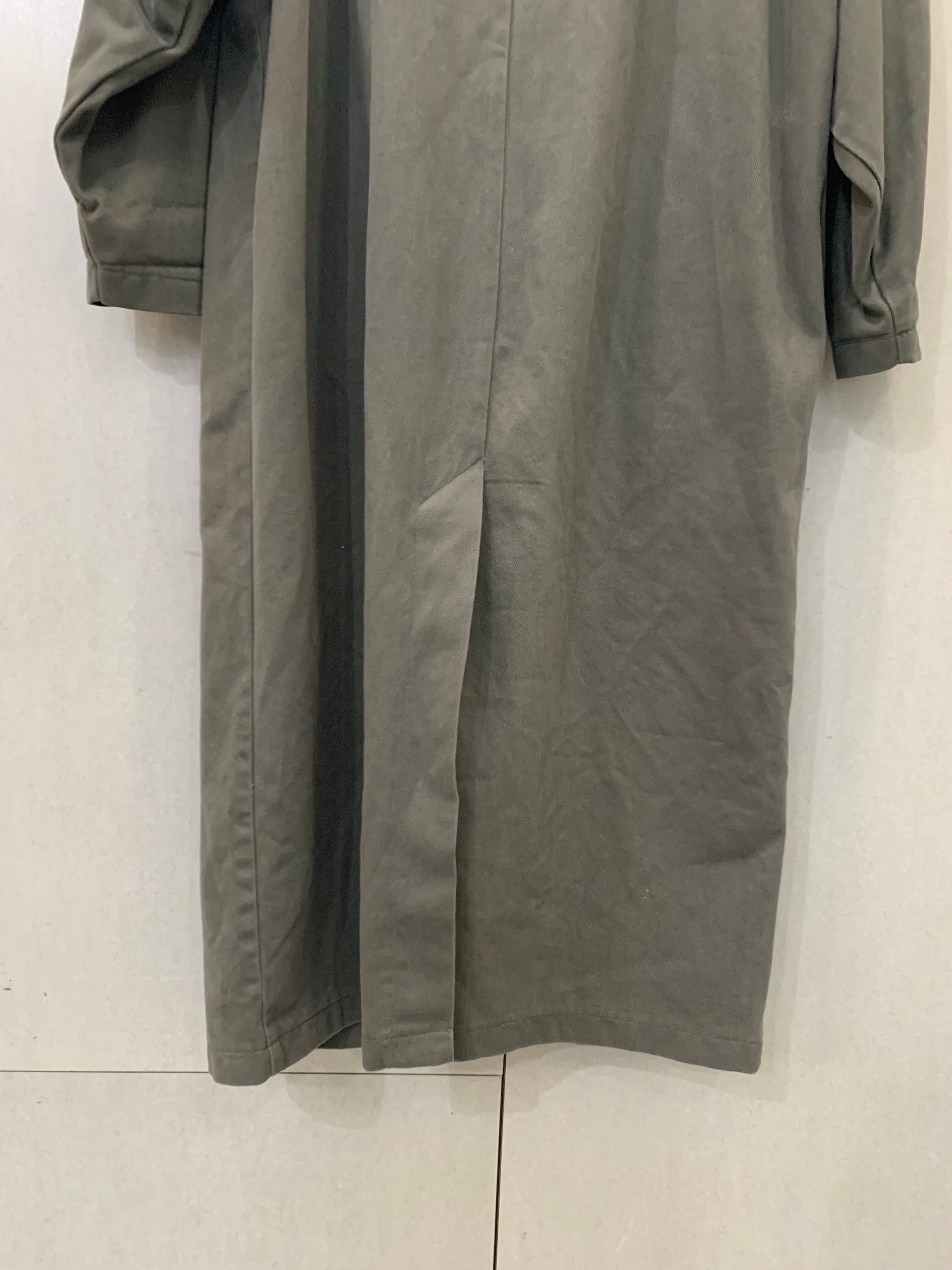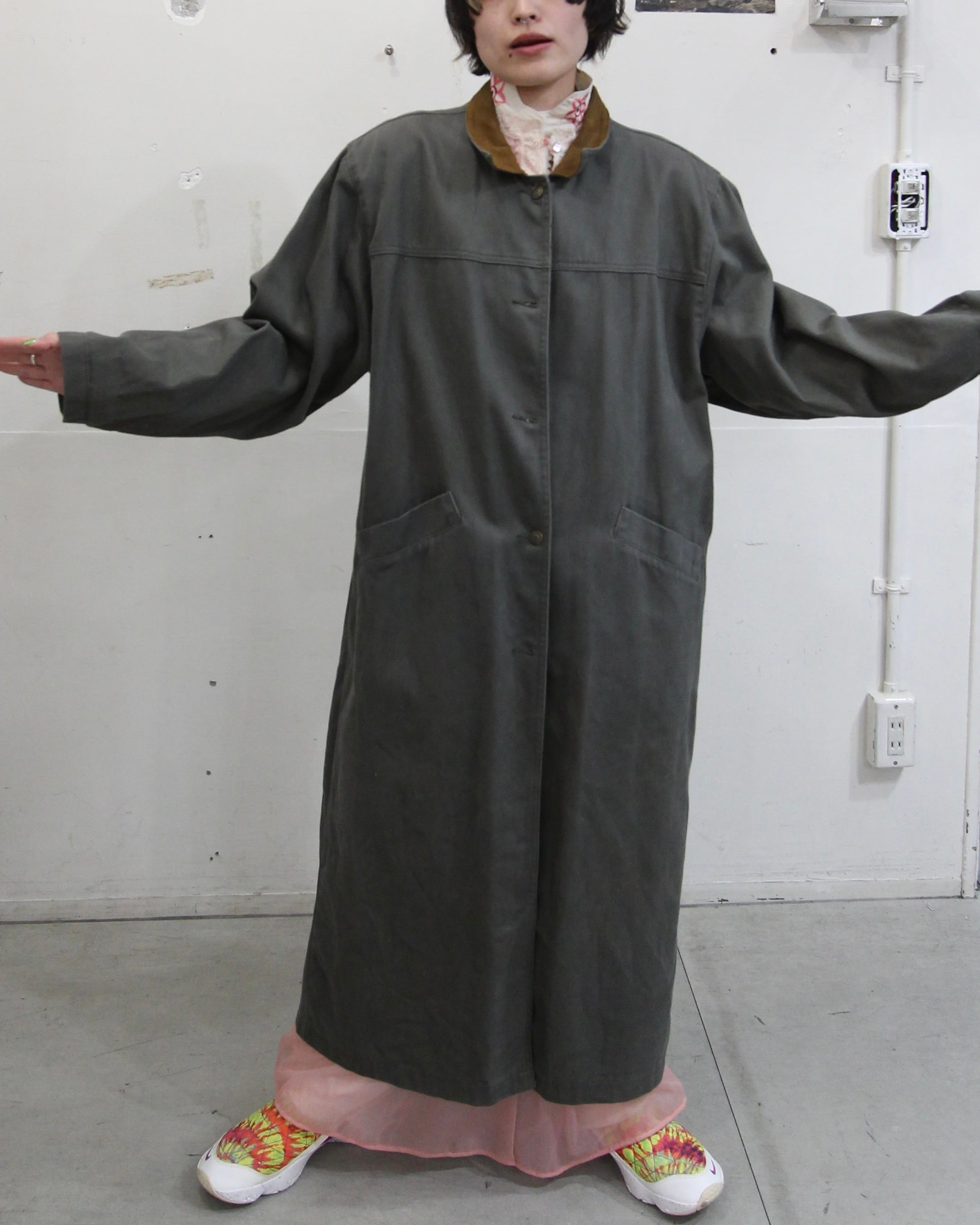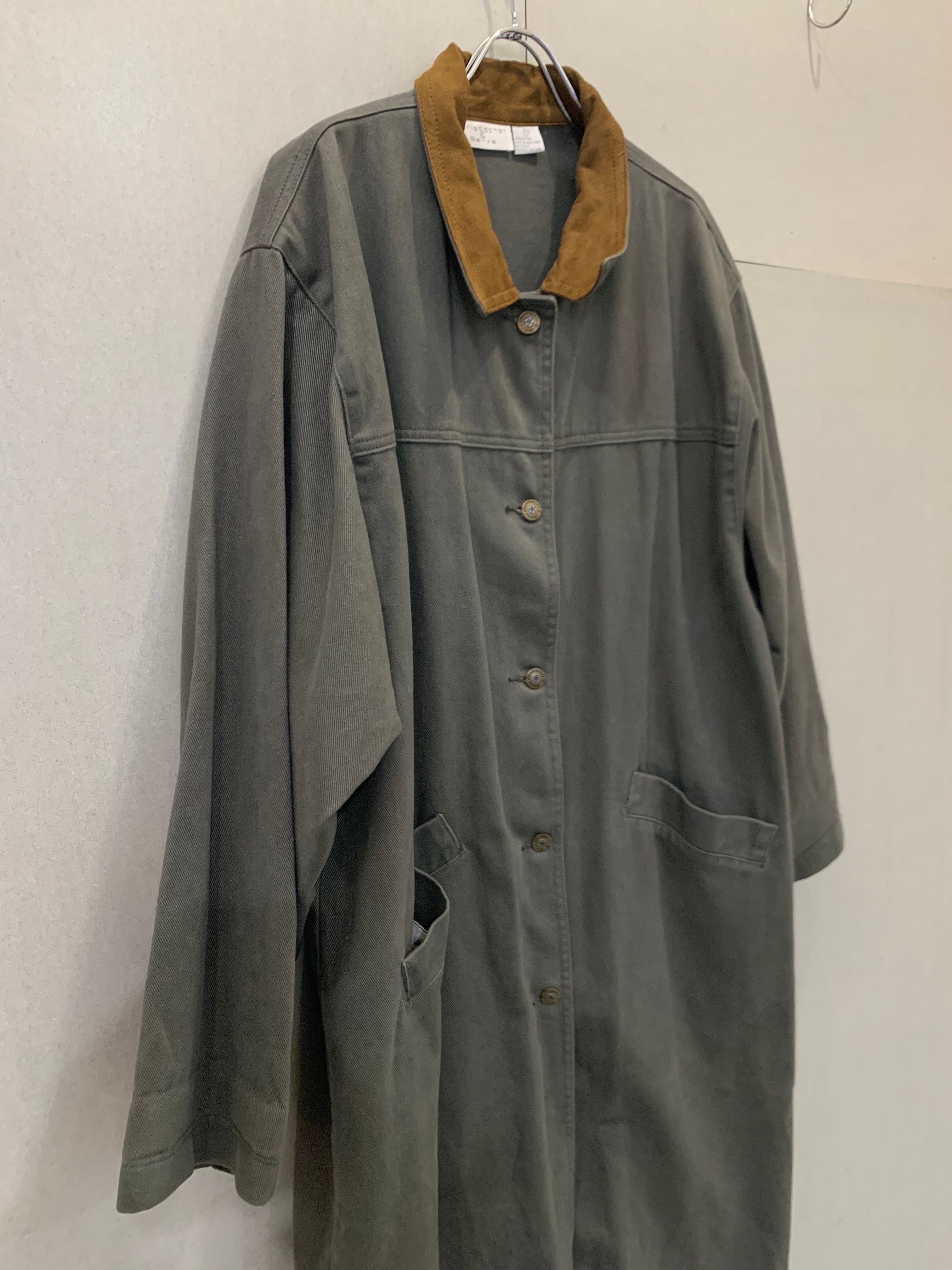 カーキのデニムコート、しかも足首まであるフルレングス