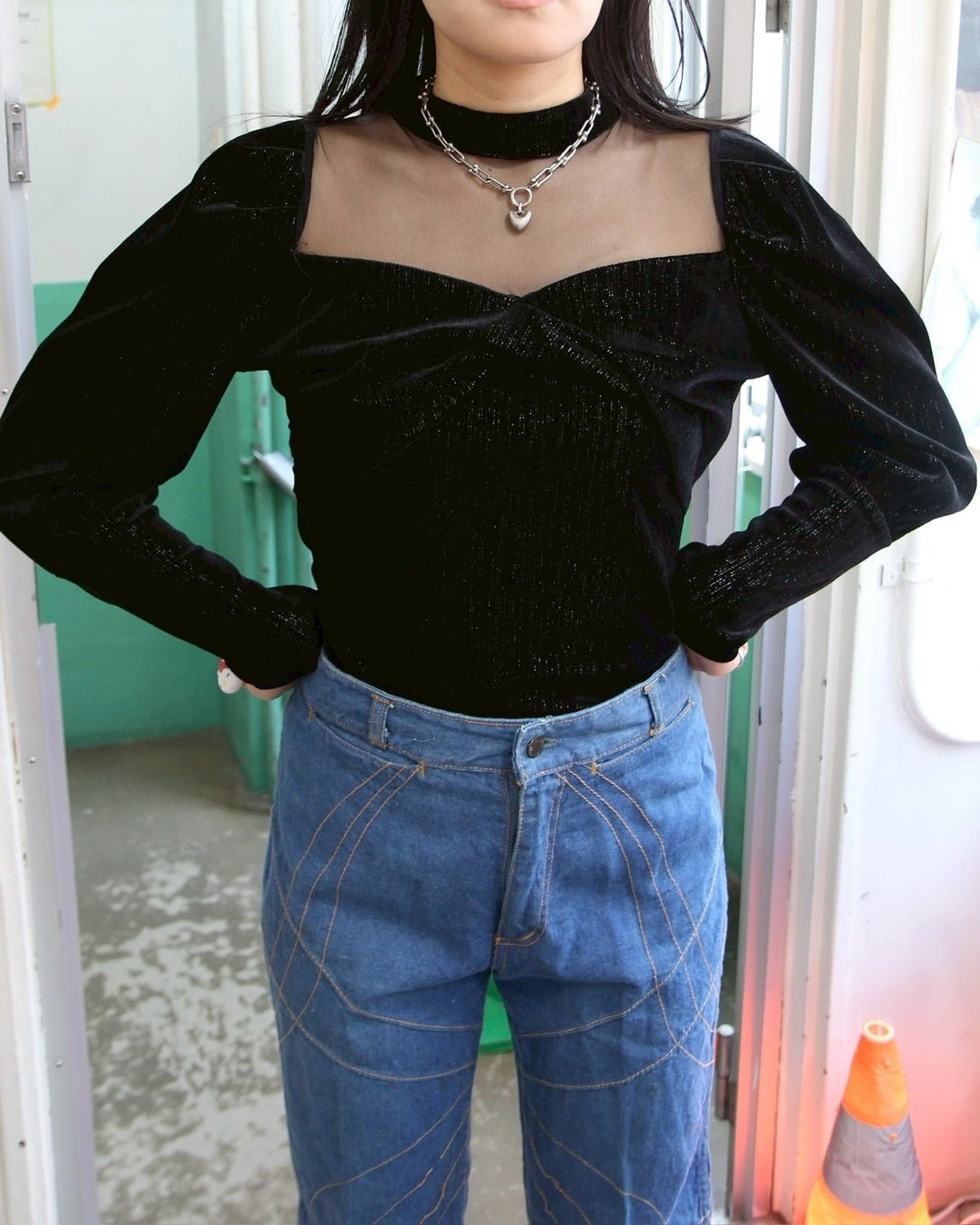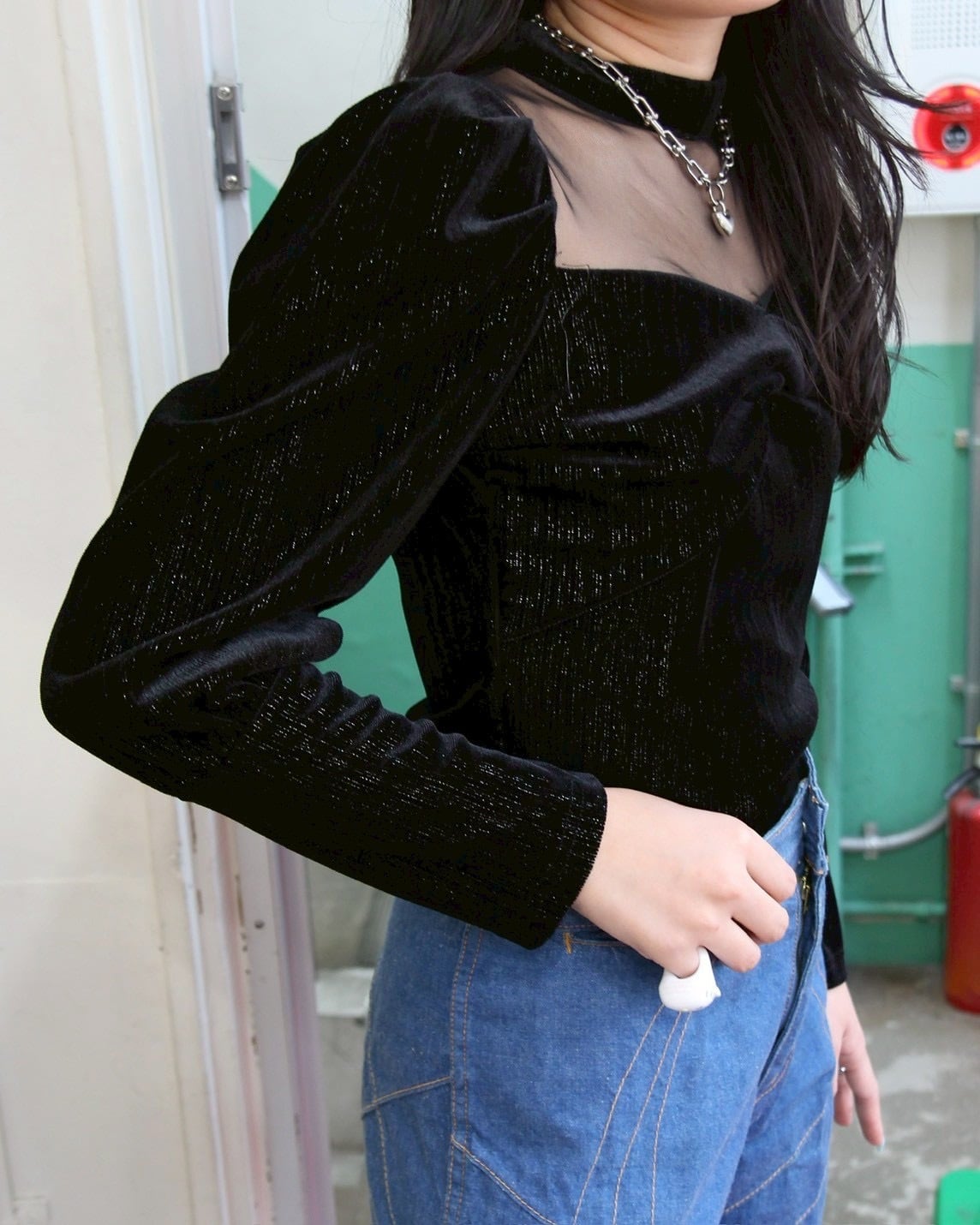 Sheer neck velor tops